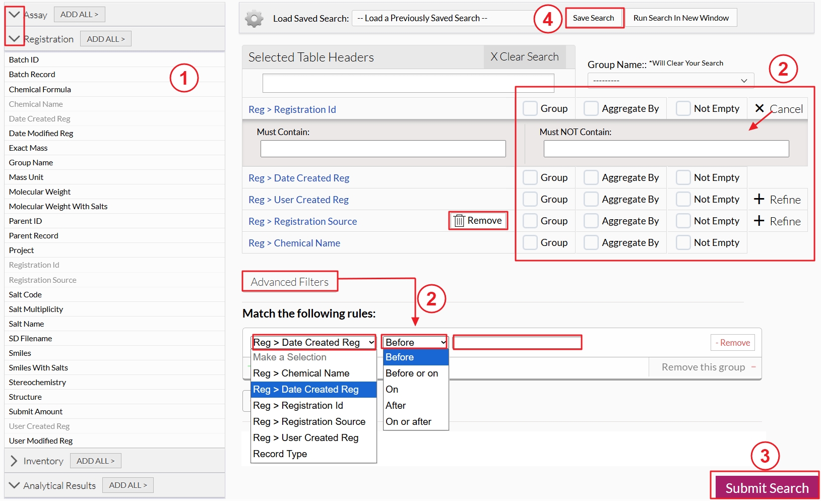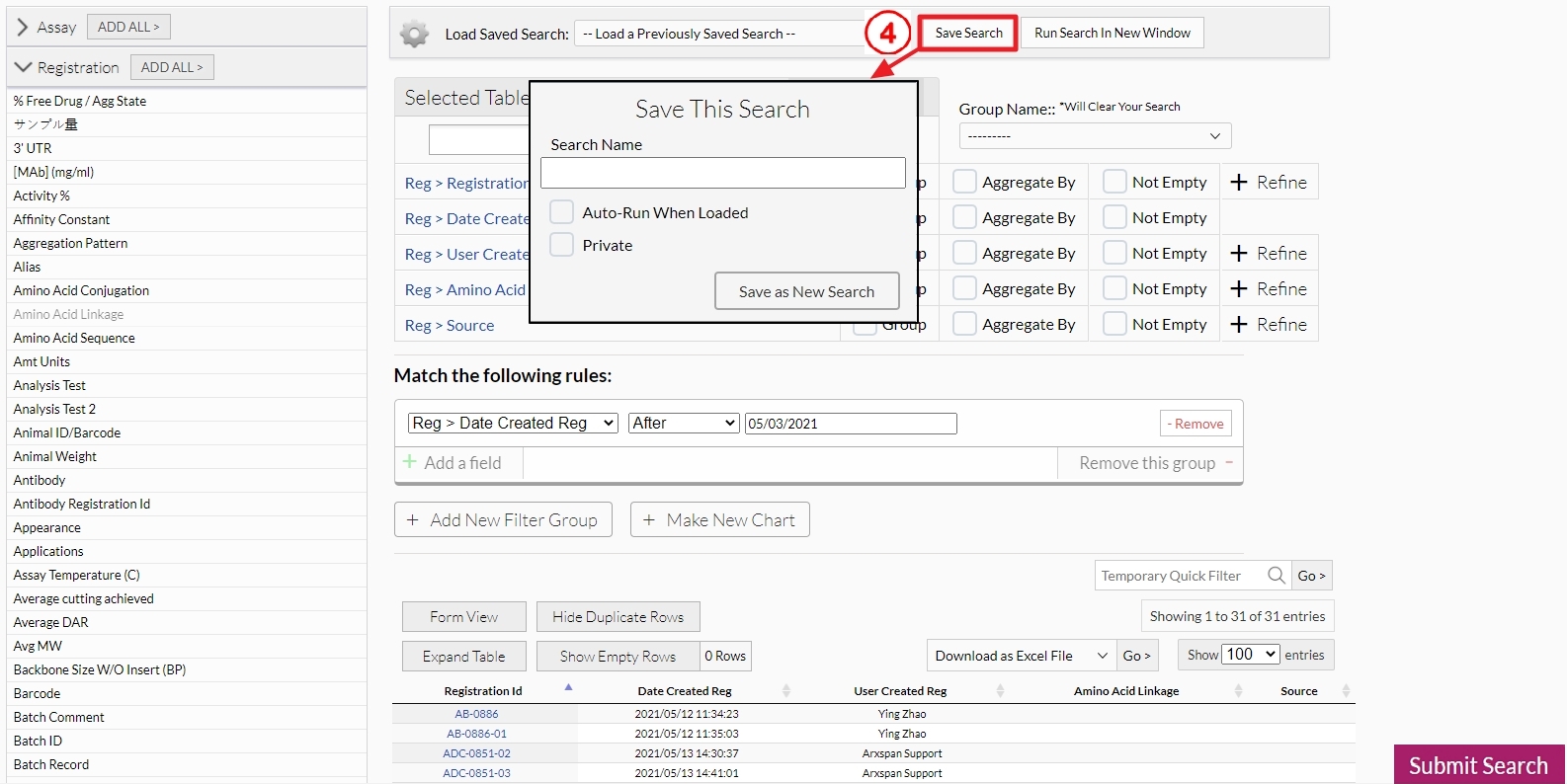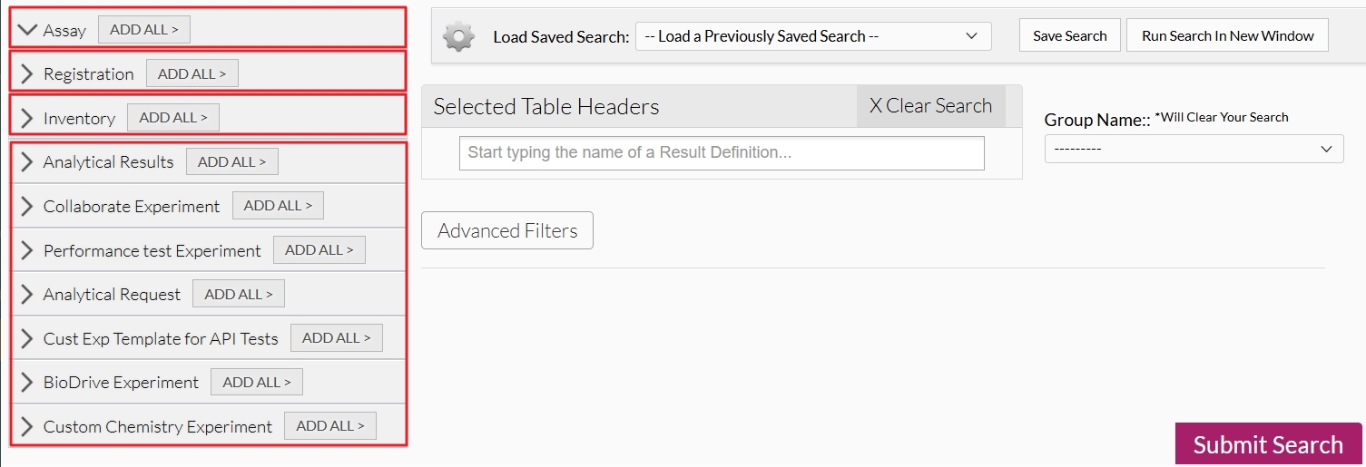 Depending on what module(s) your company has, you will see the available module(s) on the left side of the search window. Assay is for the assay module, Registration is for the legacy Registration module, and Inventory is for the inventory module. For the workflow module, all request types (custom experiment types, registration groups, and work request types) and request item types (data tables) are listed. Clicking the "ADD ALL" button will add all fields to the search criteria.