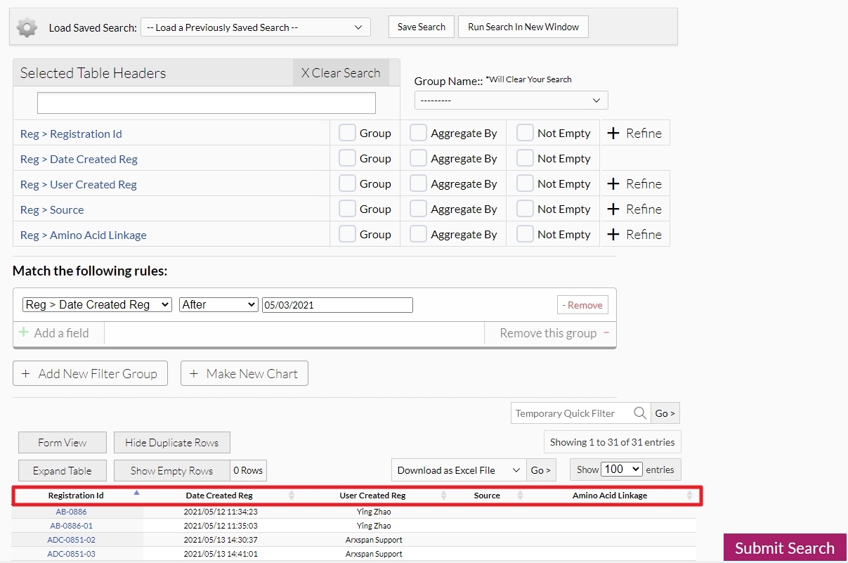 After you are satisfied with the overall search criteria, press Submit Search in the lower right corner to do the search. The search results will display below the search criteria. If you want to rearrange the order of the search results, you can click on the column header of the column you want to move, drag and drop it to the desired location. This will also change the location of the search field in the search criteria above.