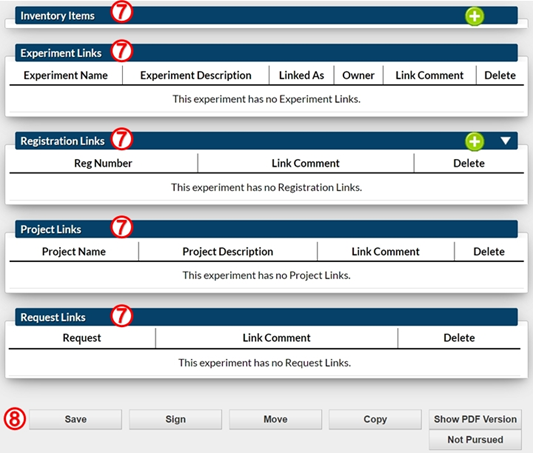 d、 链接:这将打开一个子菜单,可以给您的实验添加实验、项目和注册(如果适用)链接。具体操作请参阅我们的详细说明。