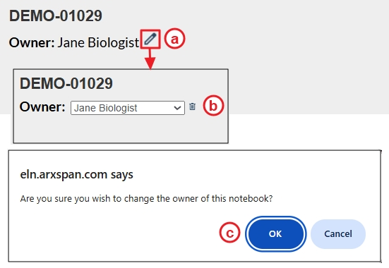- Transfer ownership of the notebook(s) that will receive the experiment to yourself. (Take a note of the current owner before transferring. You will transfer ownership back at the end of the process.) You can only move Experiments into Notebooks that you are the owner of.