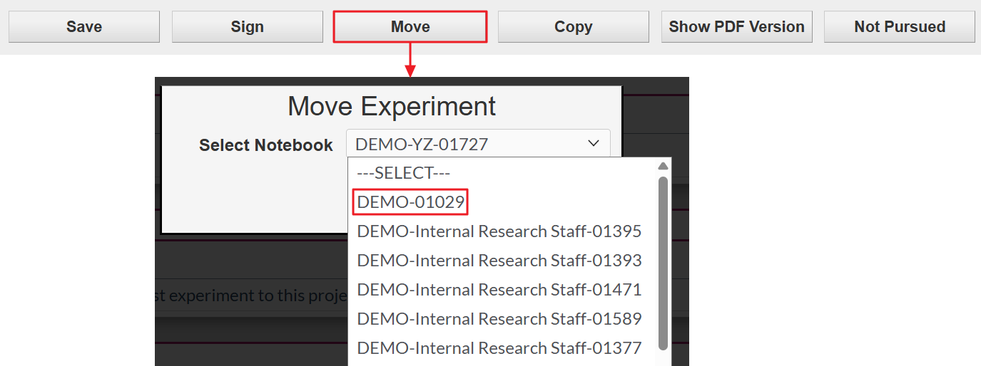 - Navigate to the experiment that needs to be moved. Scroll to the bottom of the experiment page. Click on the Move button. From the dropdown list that displays, select the Notebook destination. Click on the Move button to complete the action. If the Move button is not visible, you may need to Save the Experiment.