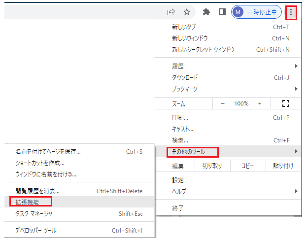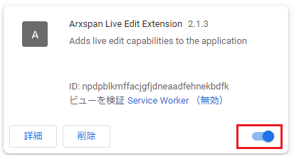 ChromeでLive Edit編集拡張機能をオンにする Masaki Takita 10月 17, 2022 3 Chrome ウィンドウの右上にある [その他] (縦に 3 つ並んだ点) をクリックします。 「その他のツール」をクリックしてから、「拡張機能」をクリックします。 拡張機能ページで、「Arxspan Live Edit Extension」を見つけてオンに切り替えます。(下記はオンになっている状態です)