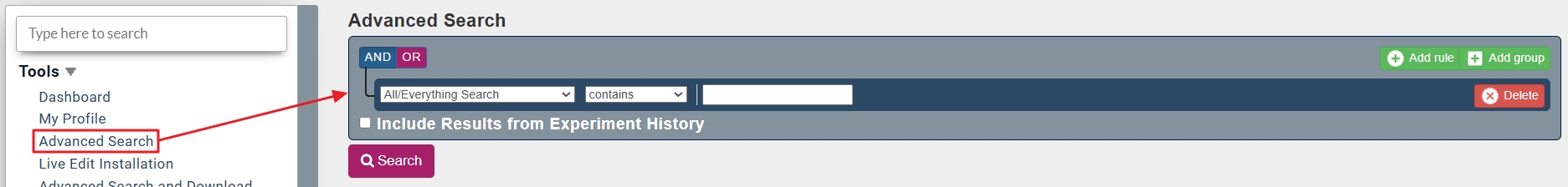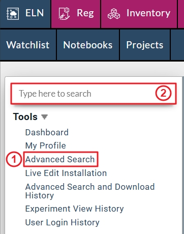 As shown in the screenshot below, Advance Search can be accessed from two spots within the left navigation bar. Either by clicking (1) Advanced Search under Tools, or by typing information into the (2) Quick Search bar and pressing enter on your keyboard. Either way will direct you to Advanced Search. This feature allows users to build complex queries to search for content within experiments, notebooks and projects that are, as previously stated, out-of-scope for a Quick Search.
