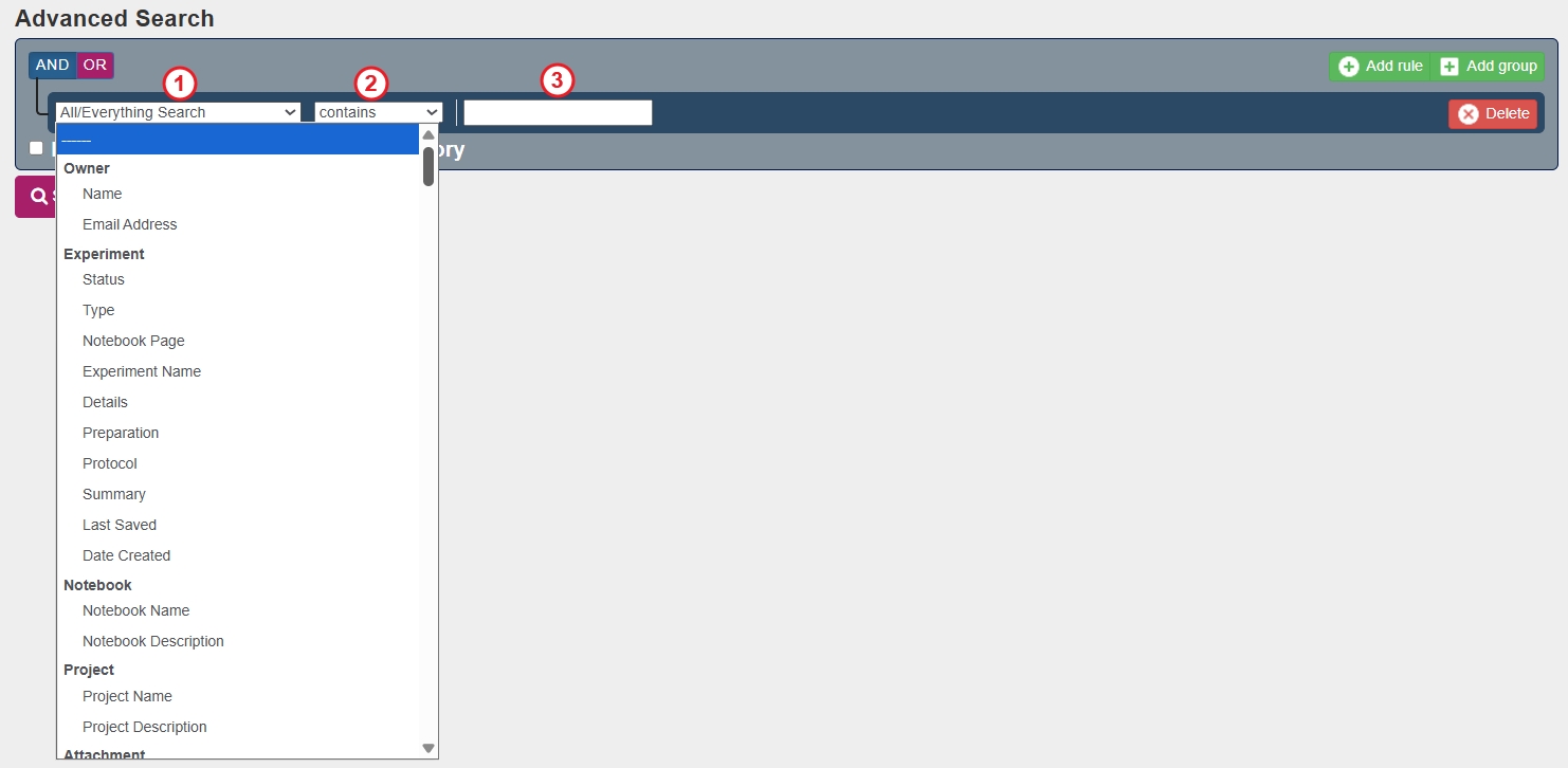 To begin, set the criteria for your search by clicking on the dropdown labelled (1) in the screenshot below. Advanced Search allows a user to search the system for a variety of different data which are sorted in the dropdown menu by category. In addition to the search criteria shown below, users can search by chemical structure data, data within Custom Experiments, etc. As shown in the screenshot below, users also have the option to select either contains or does not contain from the dropdown labelled (2), while the text box labelled (3) provides a space for the user to specify the data/keyword they are searching for. Please note, the text entered in (3) is not case-sensitive.