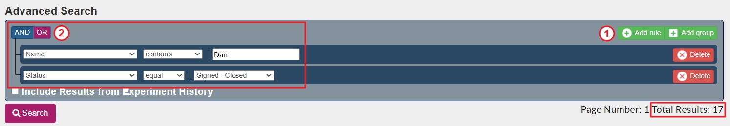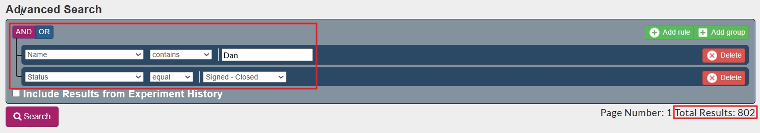 In this example, the system will search for any experiment with a Signed/closed Status as well as any experiment in which the Experiment Owner is Dan (regardless of the experiment’s status).