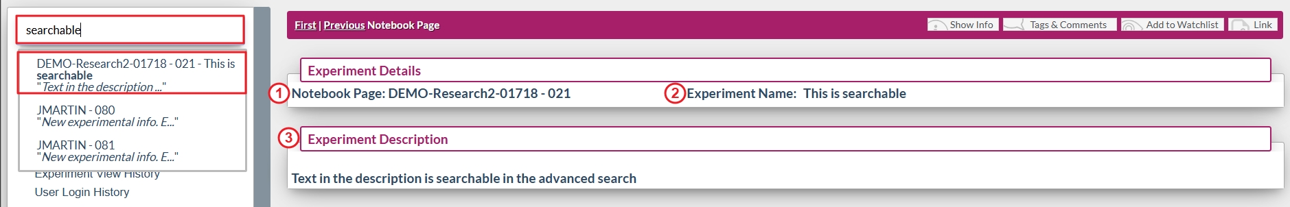 The Quick Search bar is located at the top of the left-hand navigation bar, as outlined in red in the screenshot below. By using this, you can search experiments by the contents of the Experiment’s (1) Notebook Page, (2) Experiment Name or (3) Experiment Description.