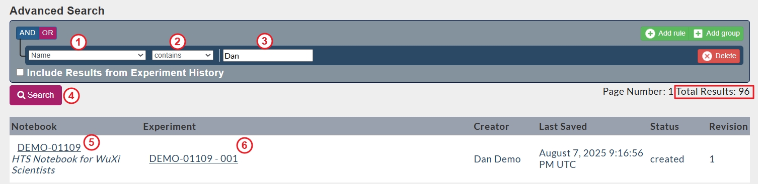 In the example below, the user is searching for all experiments that meet the following criteria: (1) “Experiment Owner” (2) “Contains” (3) “Dan”. Once the single search parameter has been specified, the search will run once the (4) Search button is pressed. As highlighted in red, the search below generated 96 results (experiments) in which the Experiment Owner’s name contained “Dan”. As shown below, the results from an Advanced Search will be displayed just below the search parameters and can be sorted by the following: Notebook ID, Experiment ID, Experiment Creator, Last Saved Experiment, Experiment Status, and Revision Number. Both the (5) Notebook Number and (6) Experiment Number are live links and will open the respective Notebook or Experiment when clicked on. It is important to note that the size of your organization’s database, along with a broad search may significantly impact the time it takes for the search itself to run. In addition to this, please note that Advanced Search Results cannot be exported.
