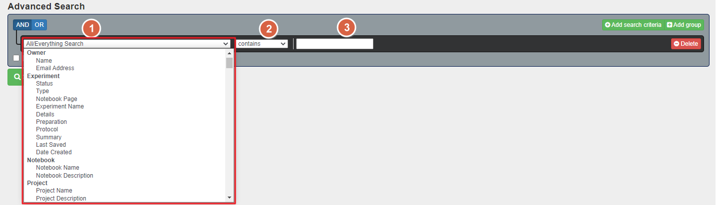 To begin, set the criteria for your search by clicking on the dropdown labelled (1) in the screenshot below. Advanced Search allows a user to search the system for a variety of different data which are sorted in the dropdown menu by category. In addition to the search criteria shown below, users can search by chemical structure data, data within Custom Experiments, etc. As shown in the screenshot below, users also have the option to select either contains or does not contain from the dropdown labelled (2), while the text box labelled (3) provides a space for the user to specify the data/keyword they are searching for. Please note, the text entered in (3) is not case-sensitive.