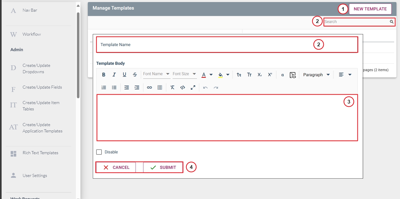 Select “Rich Text Templates” under Workflow from the left navigation bar. This will bring you into the workflow module and open the Manage Custom Template window.