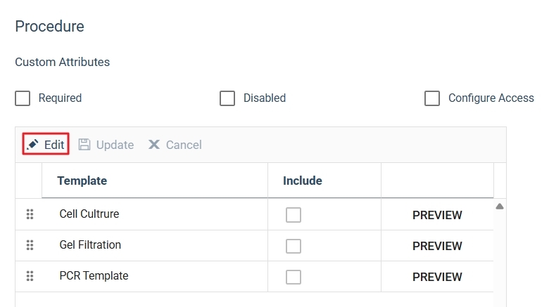 - In the new pop-up window, select the custom template you want to add, and click on “Edit’ on top of the table to enable editing.