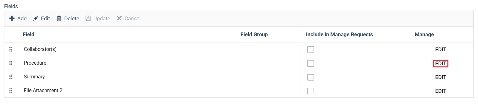 - Click the “Edit” button in line with the field that the custom template will be added to.
