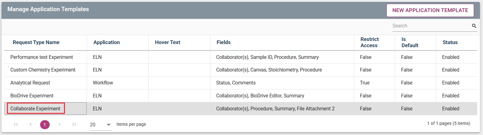 - In the Manage Request Types window, click the custom experiment type that you want to add the custom template to. This will open the custom experiment configuration in a new window to edit.