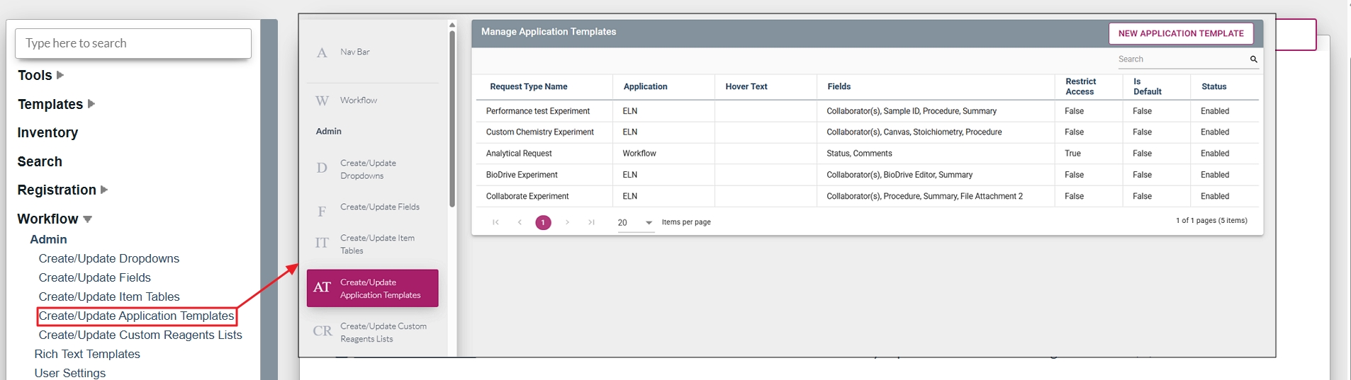Select “Create/Update Application Templates” under Work Orders from the left navigation bar. This will bring you into the workflow module and open the Manage Request Types window.