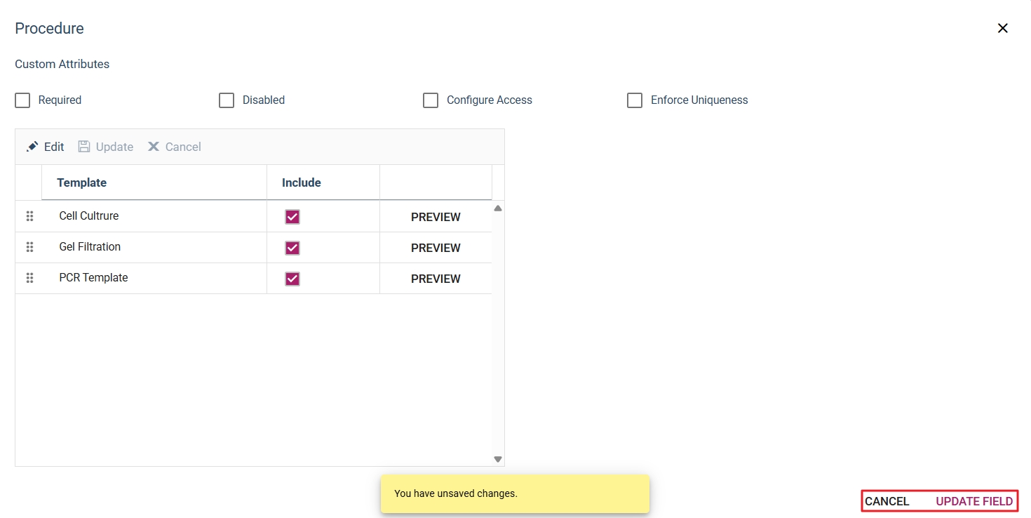 - After all custom templates are added, press the “UPDATE FIELD” to save the change to the field. If you don’t want to save any changes, press “CANCEL”.