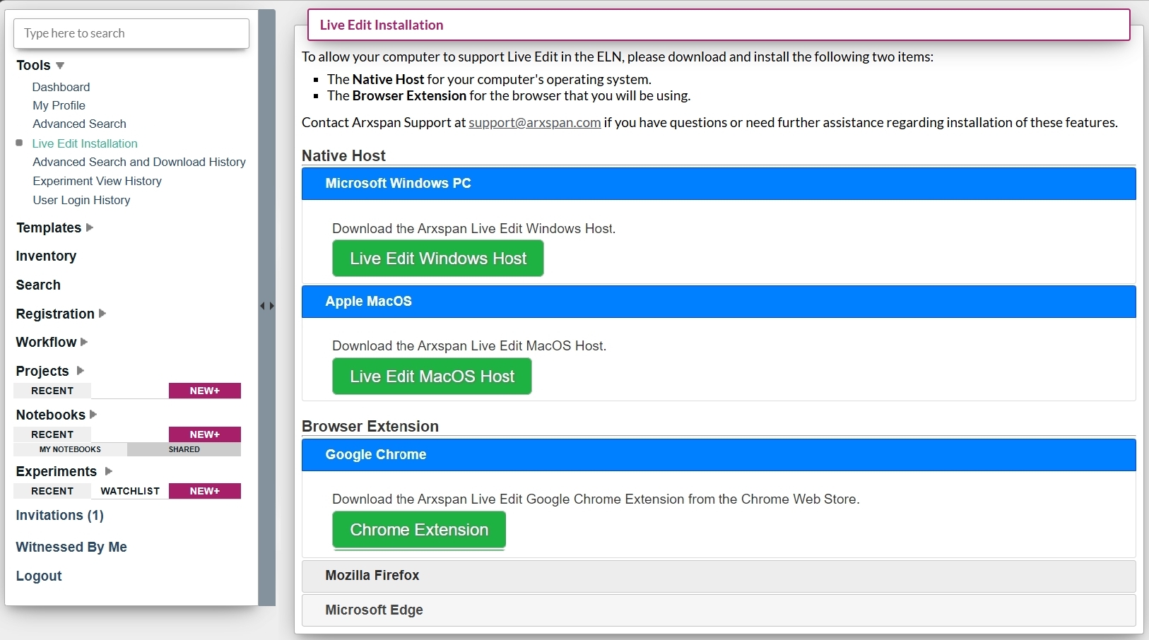 - When you click “Live Edit Installation” on the left navigation bar, the instructions shown below will appear. Please follow the instructions to install both the host file and the browser extension.