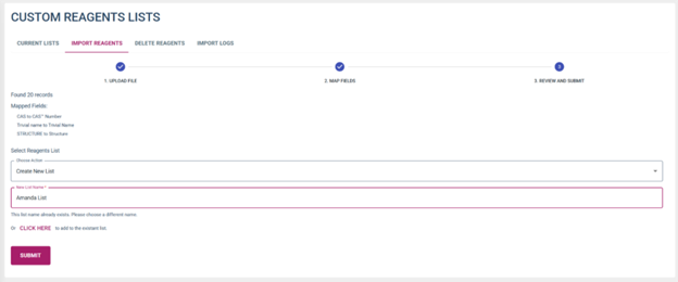 1. Navigate to the Import tab on the Create Reagents Lists page and upload an SD file containing the reagents you wish to add to your list.