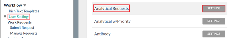 - Click the Settings button for the Request Type to be modified.