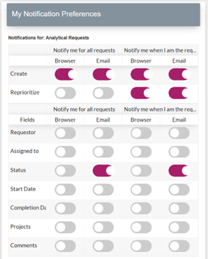 Users can customize their Notifications. They can increase or decrease the number of notifications they receive, and define if the notifications are sent via Email or Browser, or Both.