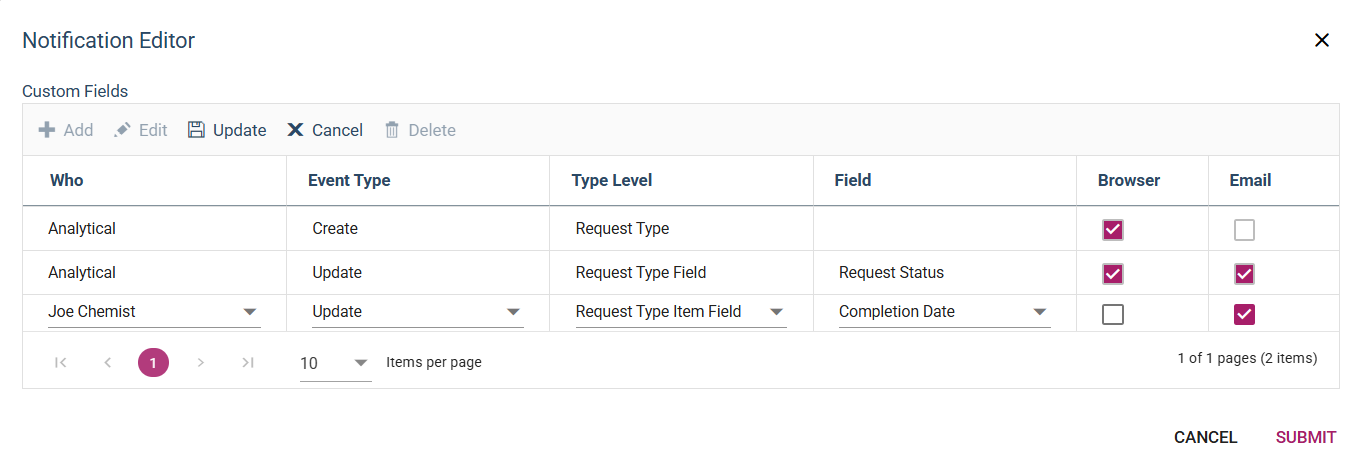 Workflow Notifications can be used to notify users when a Workflow Request is created or modified. An email message or a browser notification can be triggered when specific events occur. The Administrator can define which events trigger a Notification, who is notified (Group or Individual users), and whether the notification is in the form of an Email, a Browser notification, or both.