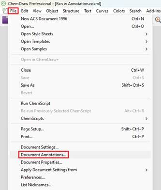 - Open the reaction file in ChemDraw. Go to File → Document Annotations.