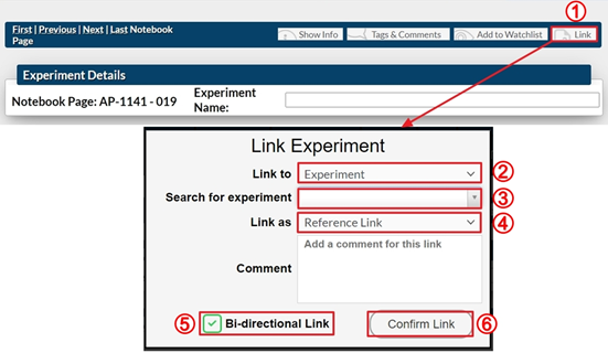 - 双向链接将在当前实验和被链接的实验中都插入链接。如果在“链接为”下拉列表中选择了“上一步”或“下一步”,则无法使用此功能。