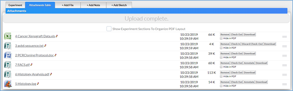 - 实时编辑也可以用于实验的附件文件。将文件附加到实验后,单击“保存”或“发布”。“借出”按钮将出现在文件名旁边。单击“借出”按钮,如果计算机上安装了所需的软件,则文件将打开。进行必要的修改后,保存并关闭文件。单击“归还”按钮以更新实验中文件的版本。如果想放弃更改,则可以使用“放弃变更”按钮。