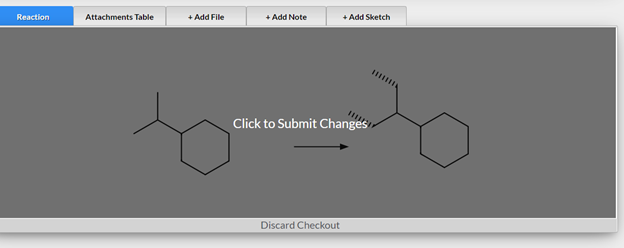 - 现在打开或创建一个化学实验,直接使用化学式绘制工具进行编辑。在结构式窗口中单击。这将启动化学式绘制工具,并允许您修改结构或添加反应。结构绘制完成后,在绘制工具中保存文件,然后将其关闭。结构式窗口将显示“单击以提交变更”。在窗口中单击以更新实验中的结构。如果结构不应该被修改,在窗口底部有一个“放弃变更”按钮。