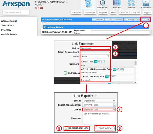 ⑤ 双方向リンク(Bi-Direction)」オプションを選択すると、現在のエクスペリメントとリンクされたエクスペリメントの両方にリンクが追加されます。前のドロップダウンで前または次のステップが選択されている場合、この機能は使用できません。