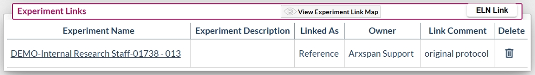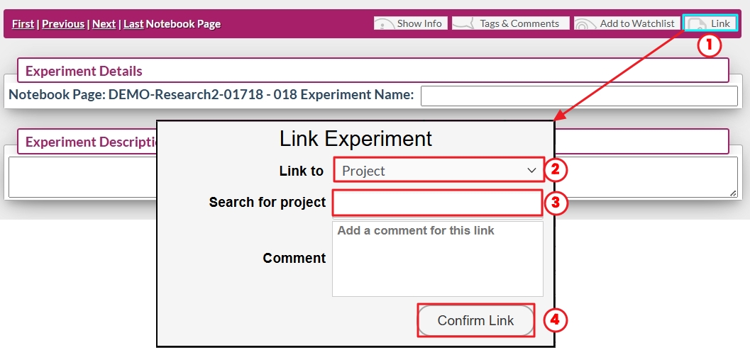 - The “Confirm Link” button will create a link in your experiment in the project links table and in the project itself.