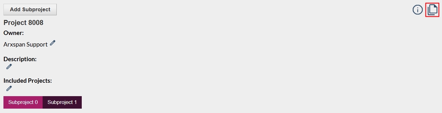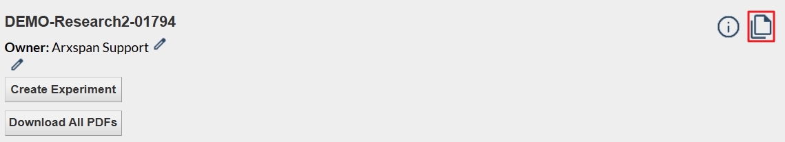 - Locate the notebook you want to add to a project and click the copy icon in the upper right-hand corner of the page. This action places the notebook into your ELN clipboard (note: this is separate from your computer’s clipboard). See the screenshot below.